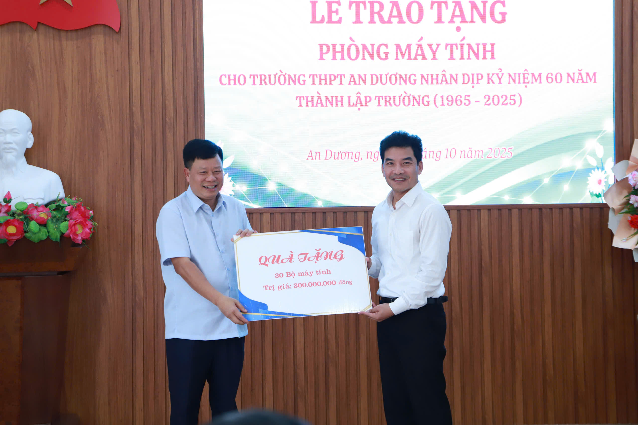 Đây là món quà vô cùng ý nghĩa do các Ông Đỗ Mạnh Hiến, Bí thư Thường trực Thành ủy, Cựu học sinh niên khóa 1983 - 1986 và Ông Lê Trung Kiên, Ủy viên BTV, Trưởng ban quản lý Khu kinh tế Hải Phòng, Cựu học sinh niên khóa 1988 - 1991 trao tặng thầy và trò nhà trường nhân dịp kỷ niệm 60 năm thành lập.