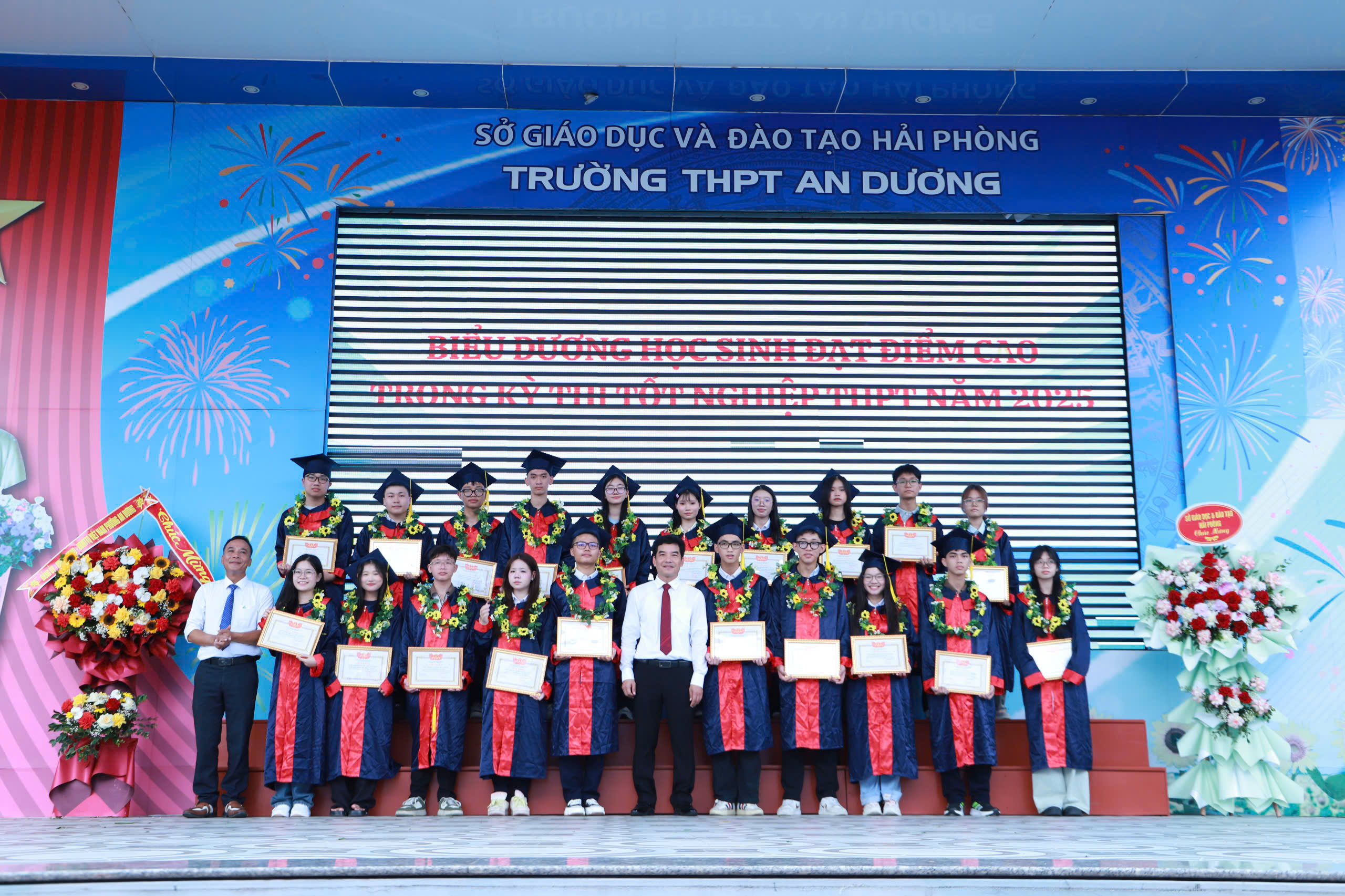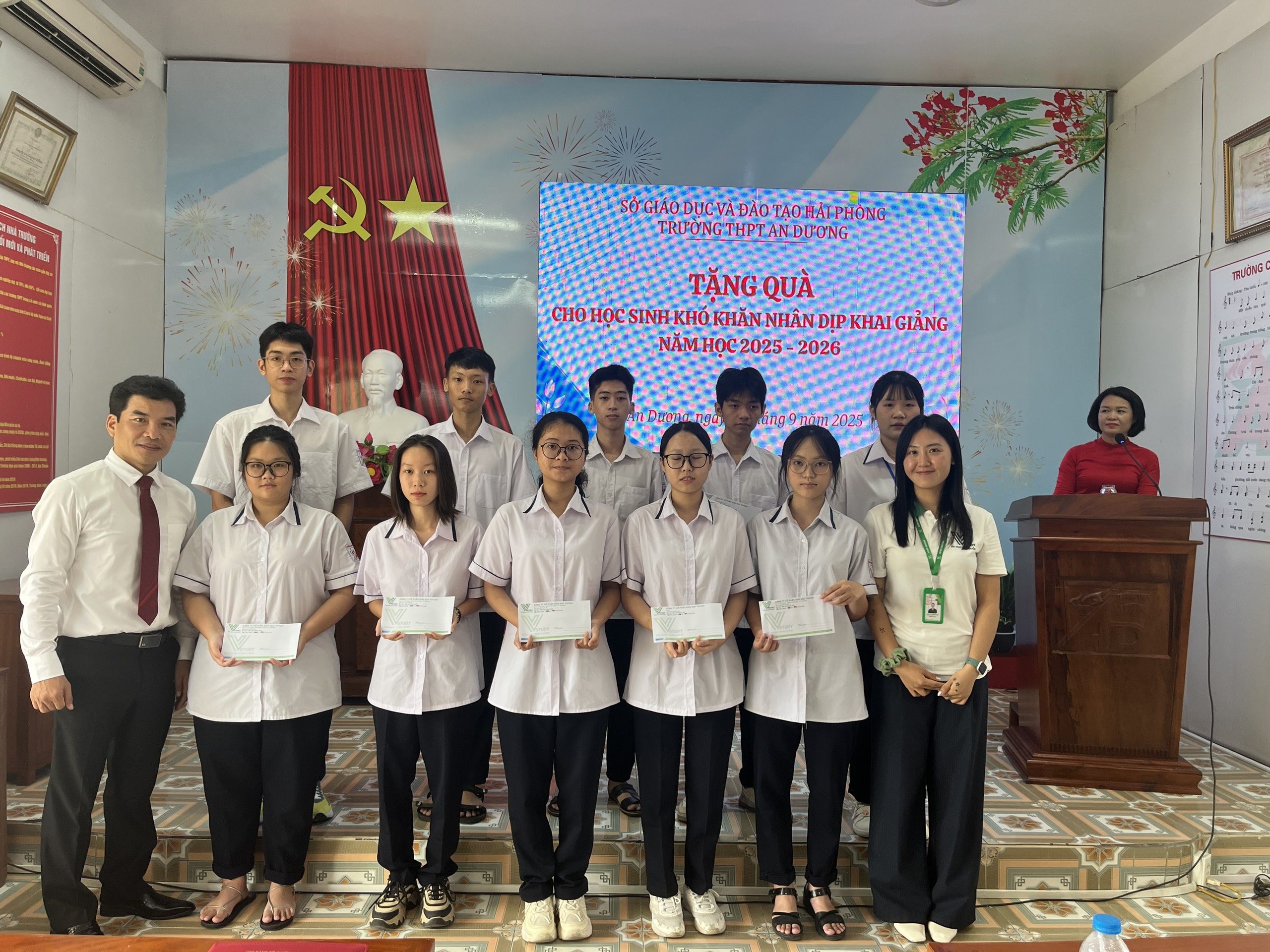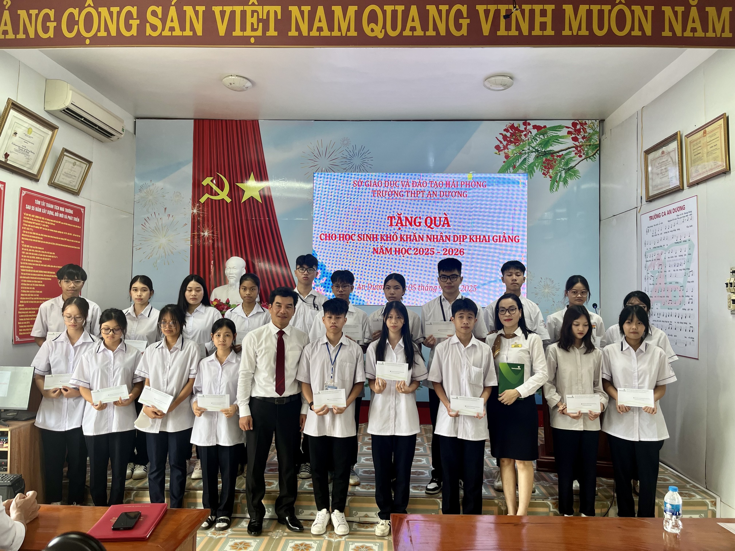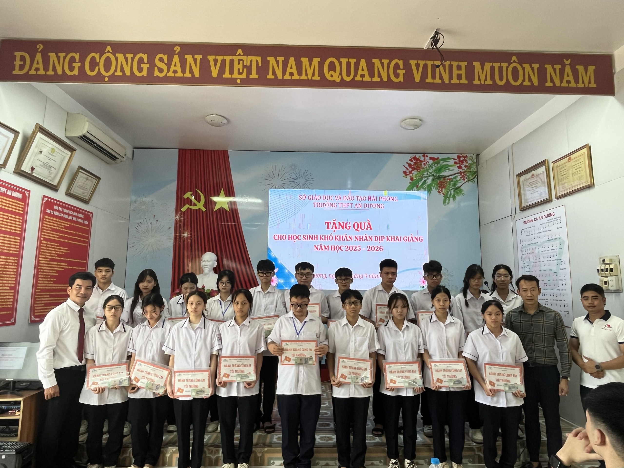 Tại Chương trình Lễ khai giảng năm nay, Nhà trường biểu dương các em học sinh có kết quả cao trong Kỳ thi tốt nghiệp THPT năm 2025 và cùng các đơn vị tài trợ trao 50 suất quà, mỗi suất 500 nghìn đồng, cho các em học sinh có hoàn cảnh khó khăn nhân dịp khai giảng năm học mới. (Ngân hàng Vietcombank An Dương: 20 suất, Công ty cổ phần Giáo dục Vstudy: 10 suất và Công ty BĐS Trí Việt: 20 suất). Đây là những món quà hết sức ý nghĩa, động viên các em học sinh bước vào năm học mới.