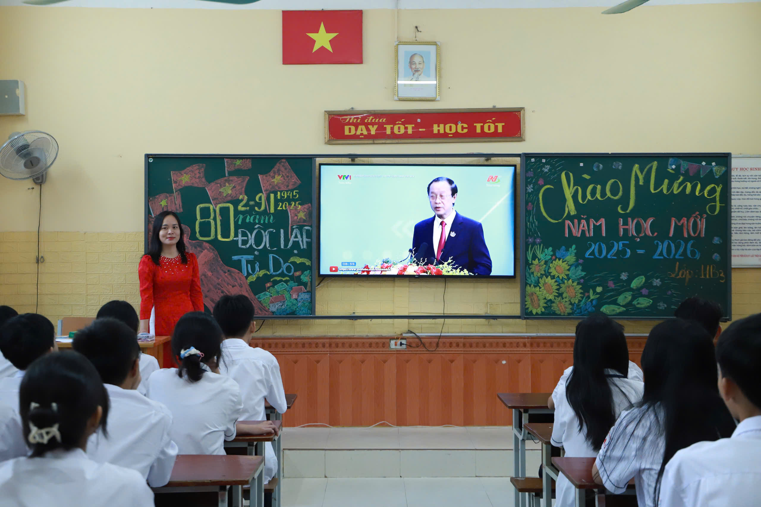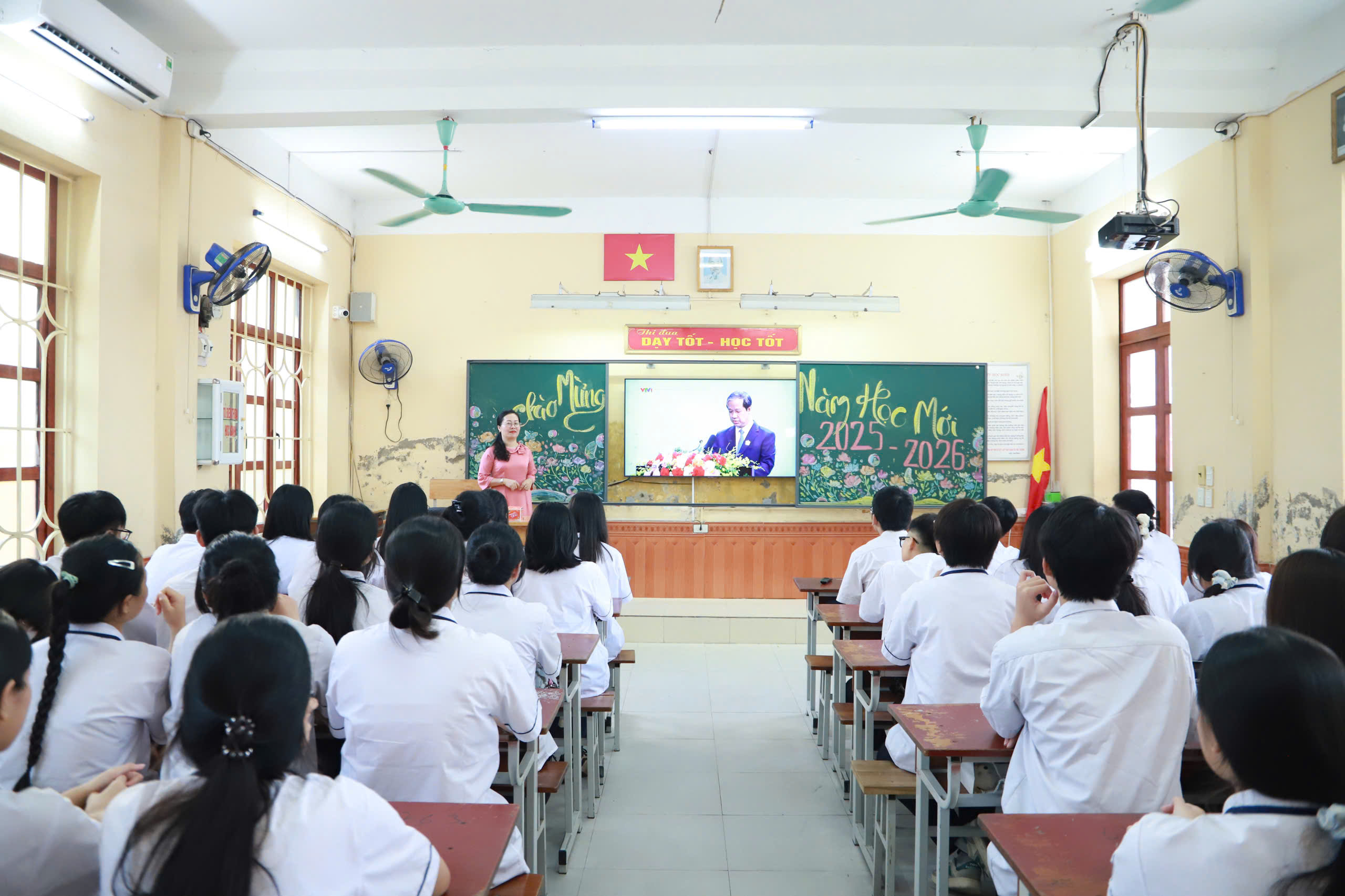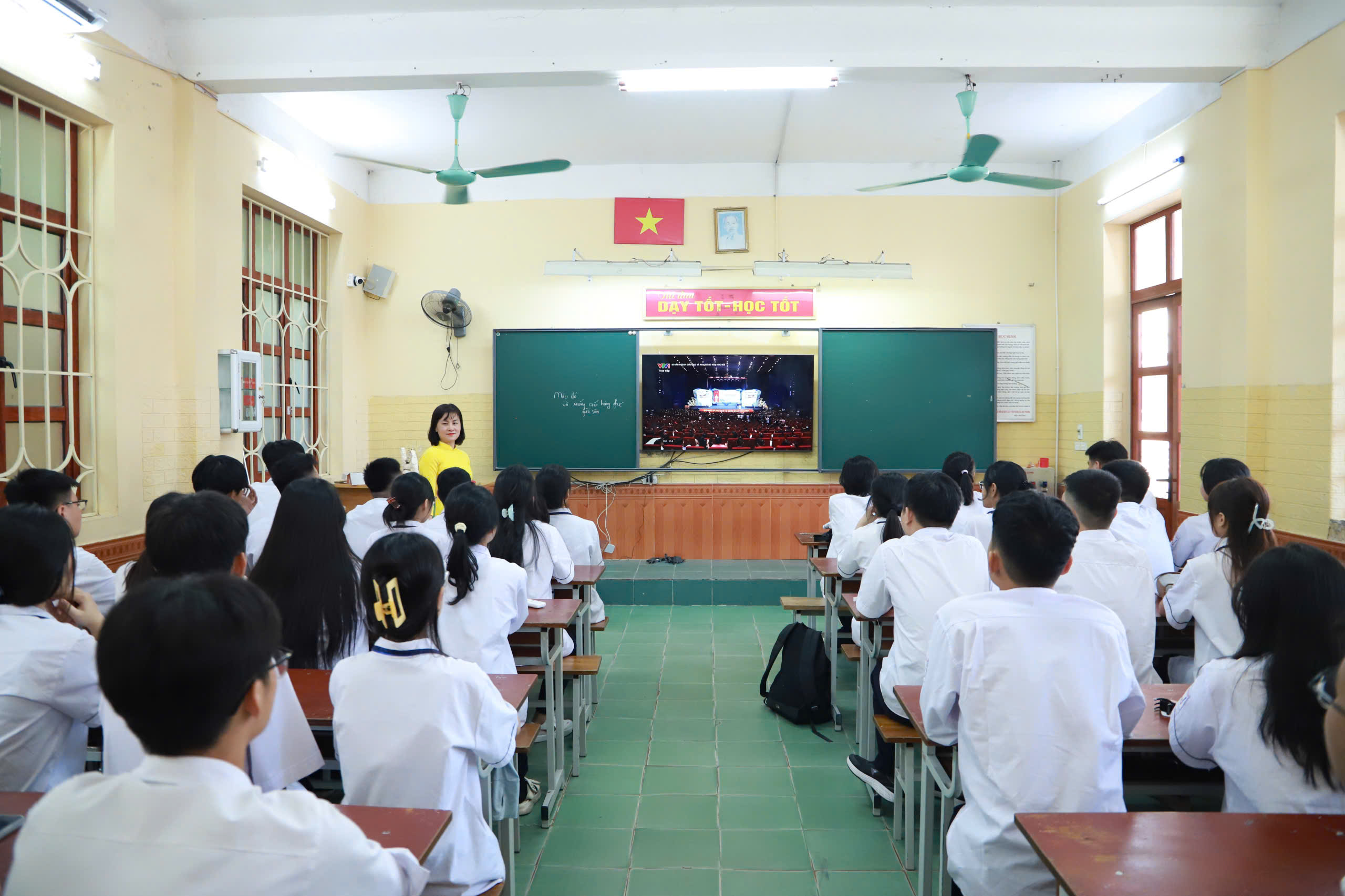 Do số lượng học sinh đông, Nhà trường đã bố trí các lớp khối sáng cùng thầy, cô chủ nhiệm dự tại phòng học, theo dỗi qua TV, các lớp còn lại và thầy cô dự tại sân trường, theo dõi qua màn hình Led cỡ lớn.