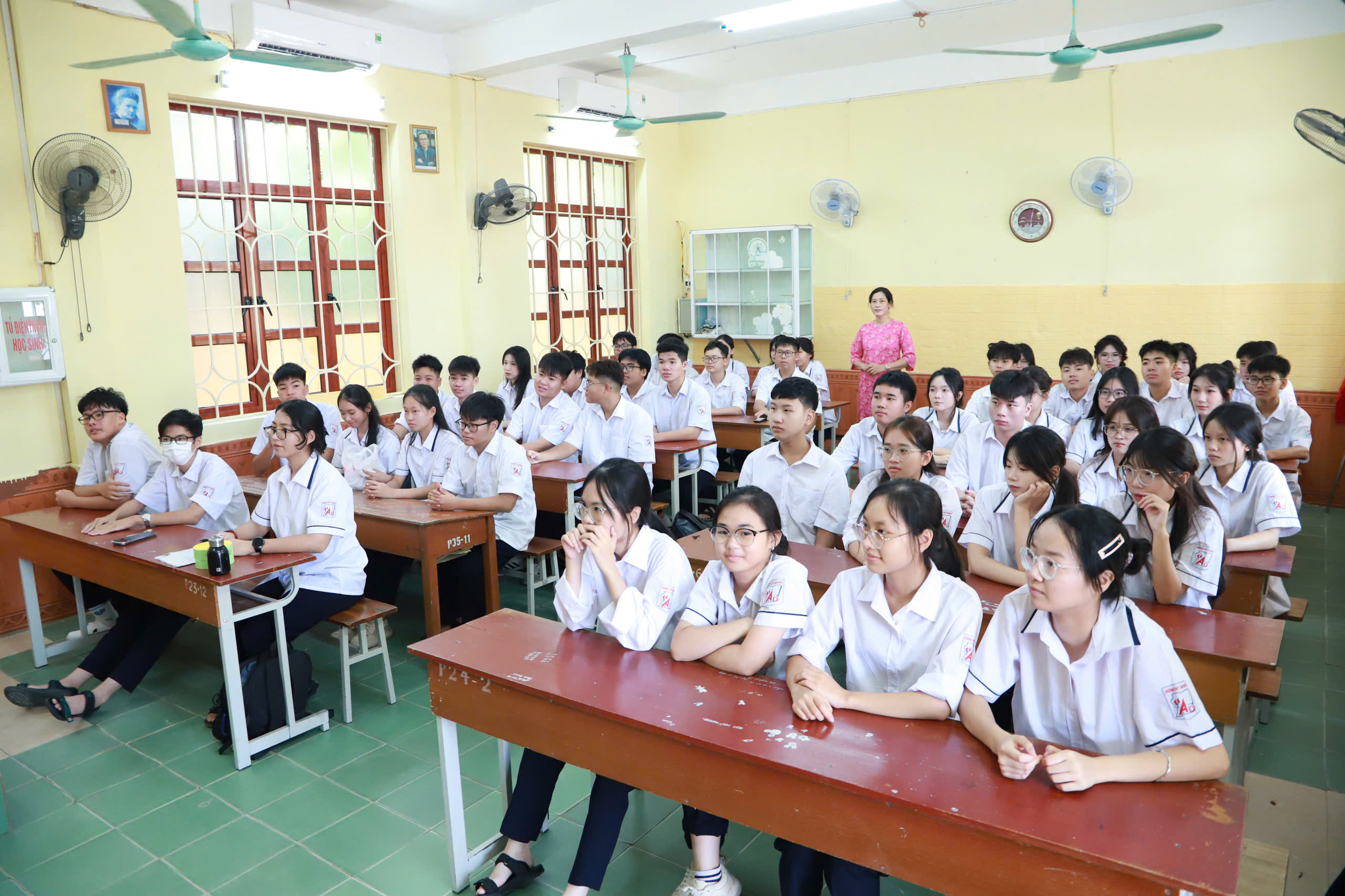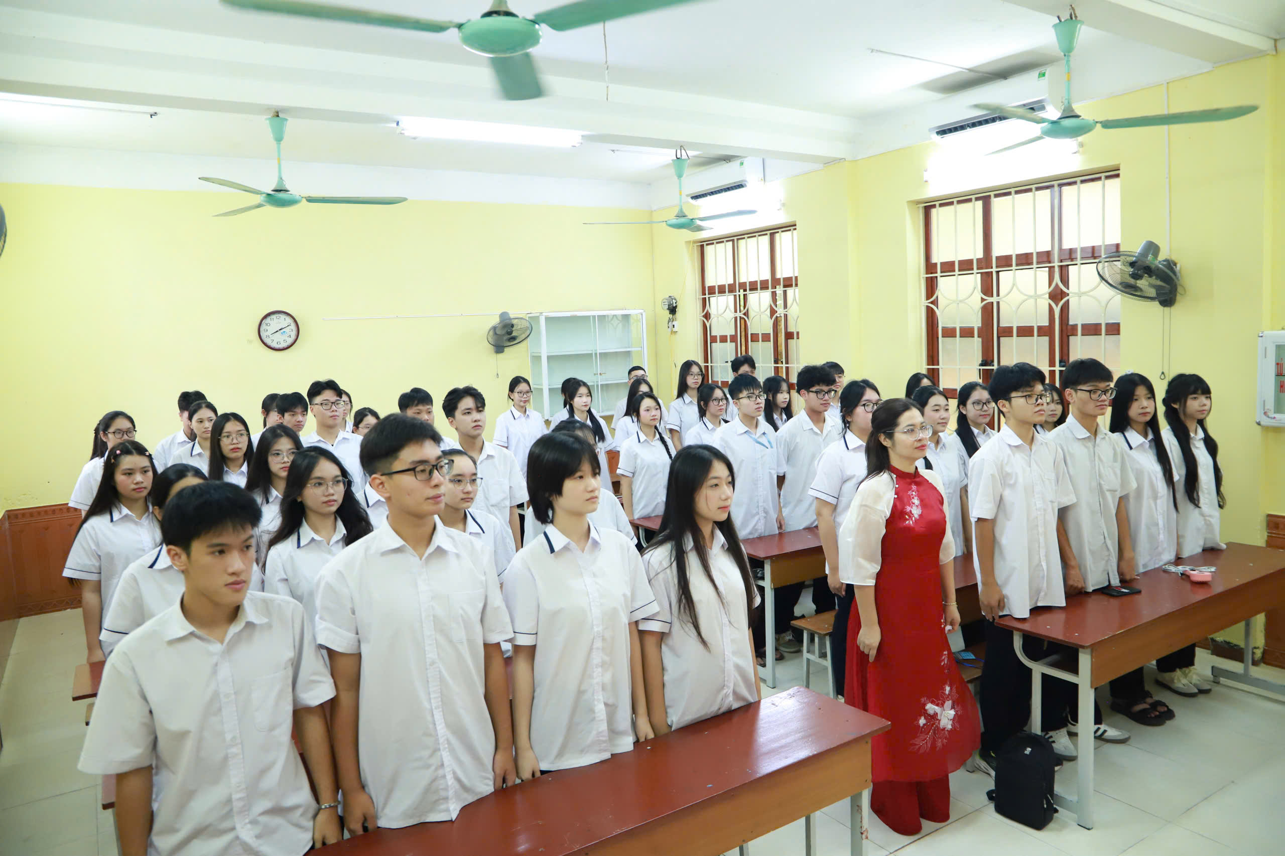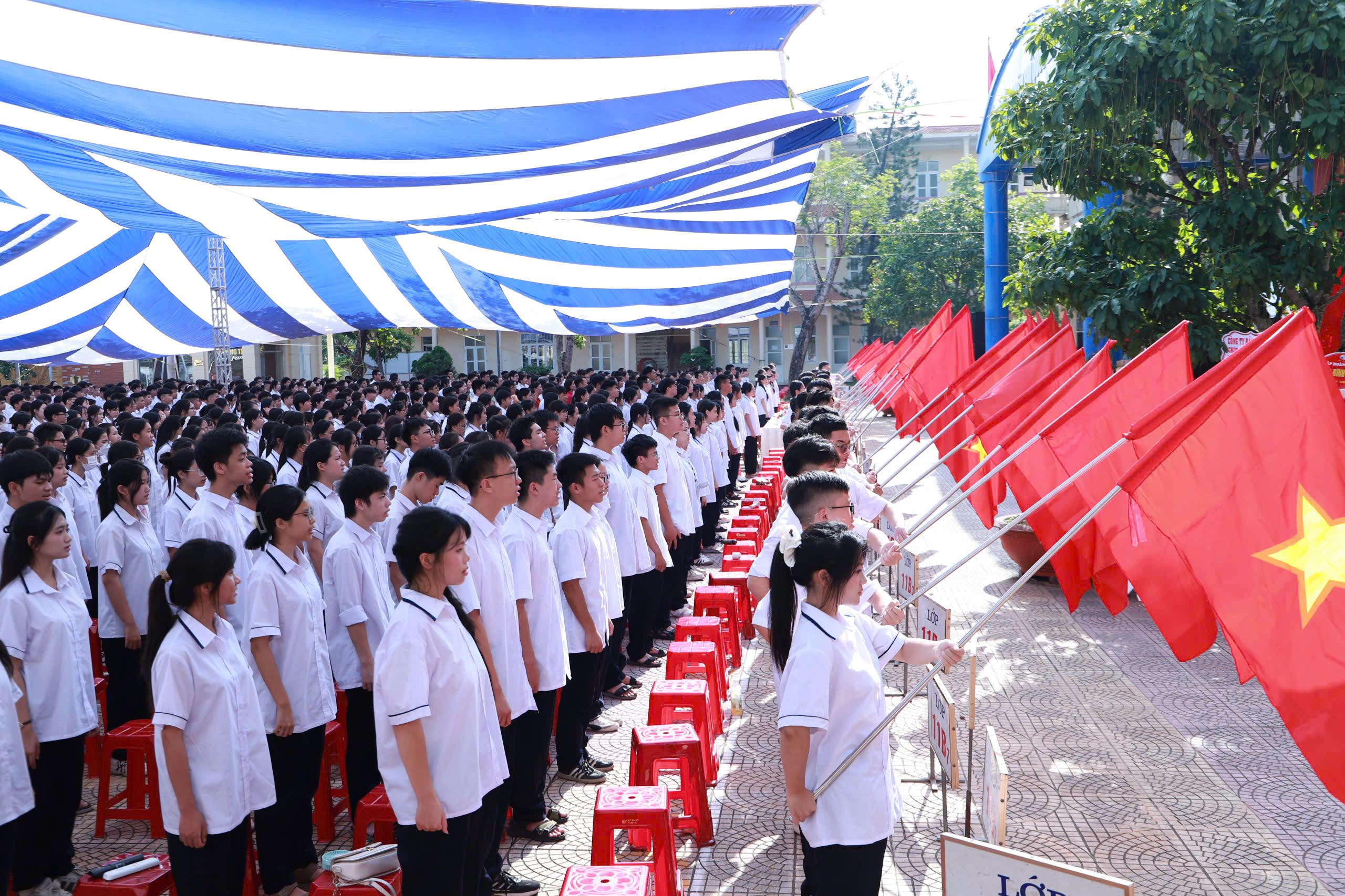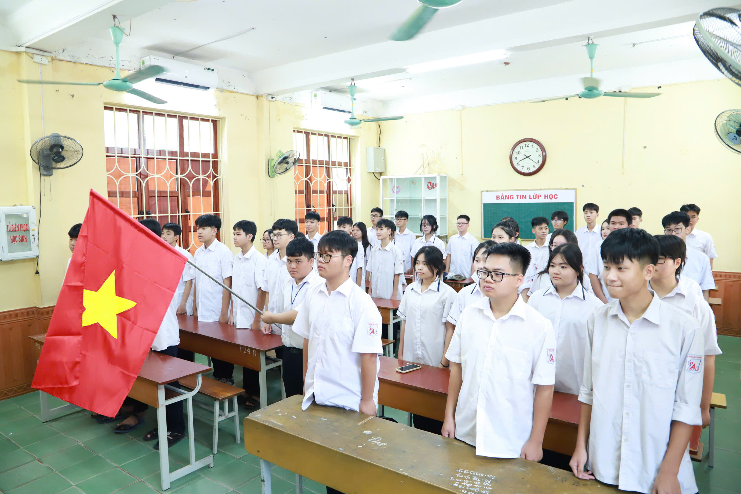Do số lượng học sinh đông, Nhà trường đã bố trí các lớp khối sáng cùng thầy, cô chủ nhiệm dự tại phòng học, theo dỗi qua TV, các lớp còn lại và thầy cô dự tại sân trường, theo dõi qua màn hình Led cỡ lớn.